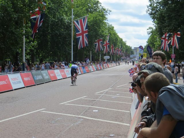| The crowd at the finishing line which is just visible in the distance in front of Buckingham Palace |